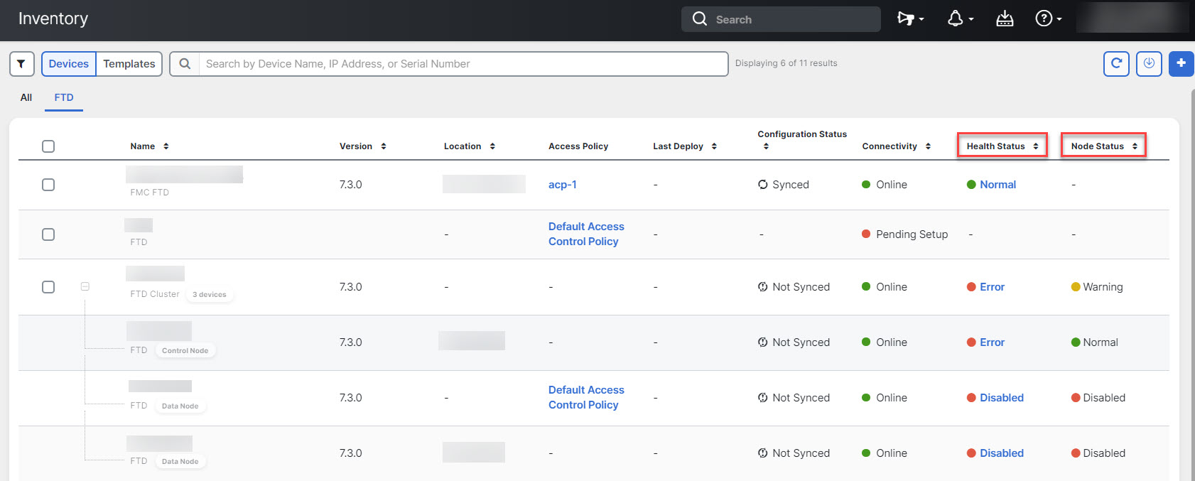CDO now displays the health and node status for threat defense devices on the Inventory page. For more details about the device health, you can click on the health status of a device to navigate to the device's health monitoring page in the cloud-delivered Firewall Management Center or the On-Prem Firewall Management Center user interface. Note that node status is displayed only for threat defense devices managed by cloud-delivered Firewall Management Center.