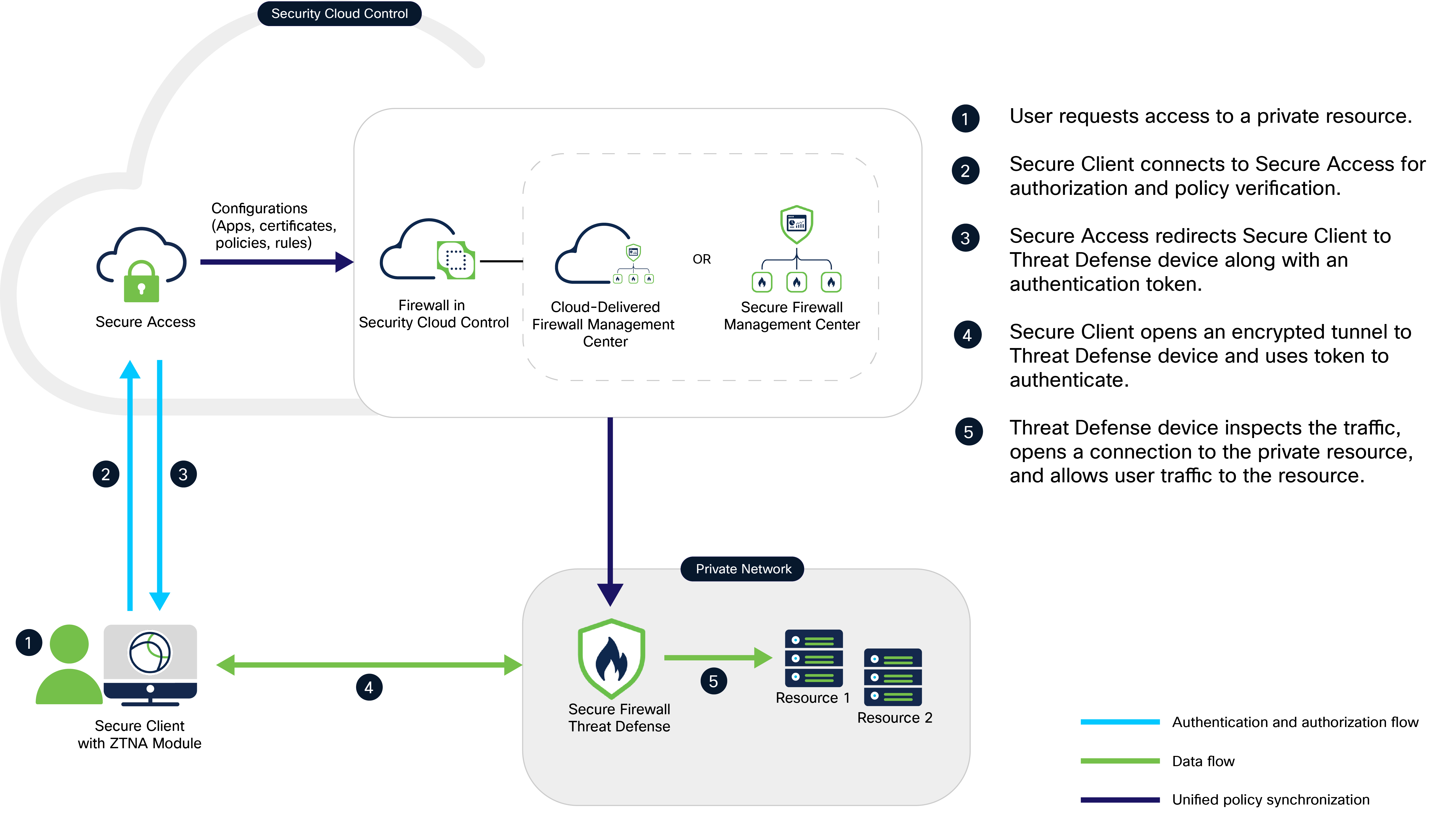 • Security Cloud Control Firewall Management: Manages the configuration and deployment of universal ZTNA policies to the Firewall Threat Defense devices. The Threat Defense devices protect on-premises resources by enforcing universal ZTNA policies. Threat Defense inspects traffic and enforces intrusion prevention system (IPS), file, and malware policies on the traffic.