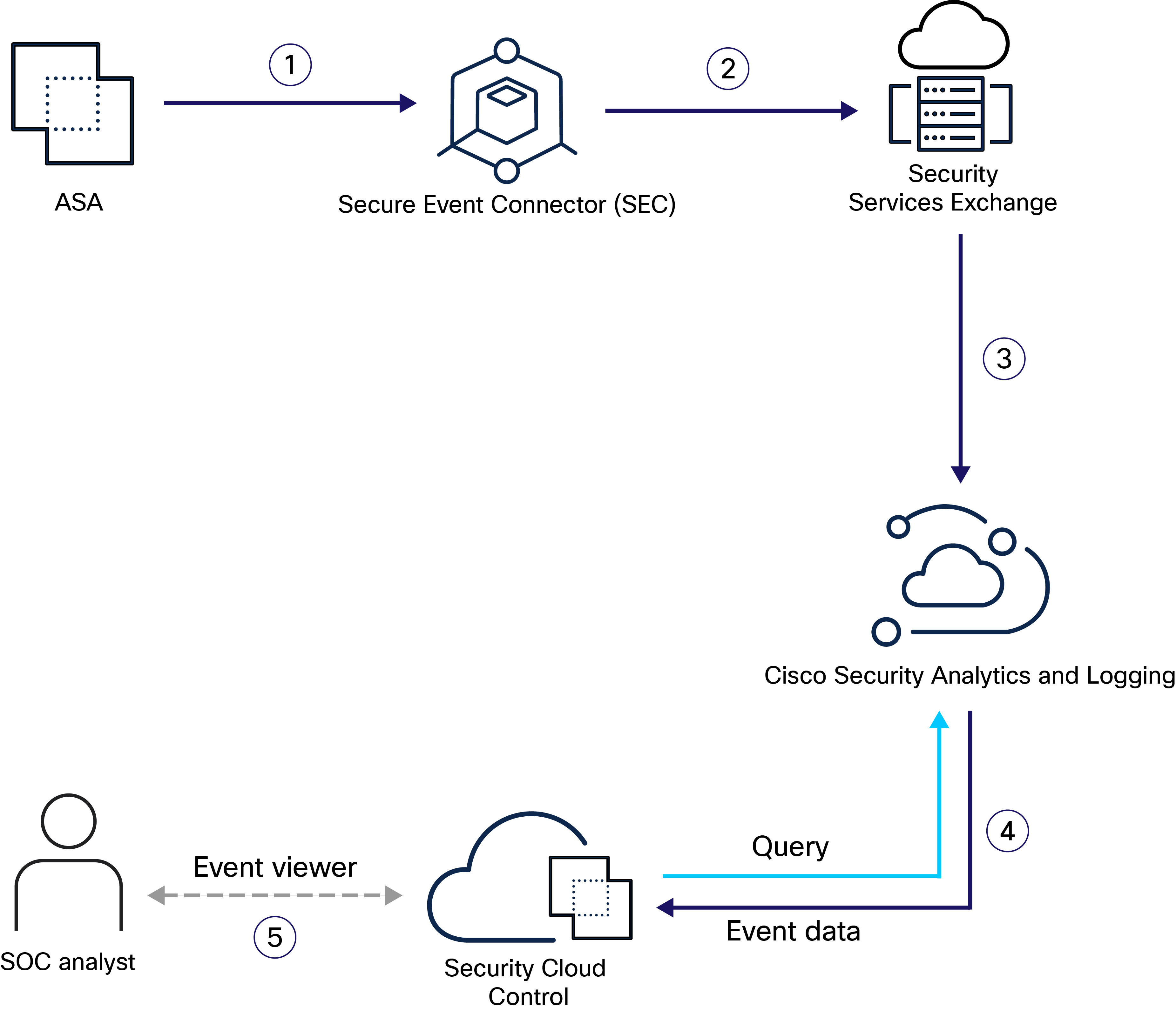 Security Cloud Control stores the event data in the cloud data store. Security Cloud Control queries the stored data to provide SOC analysts with the relevant information. |