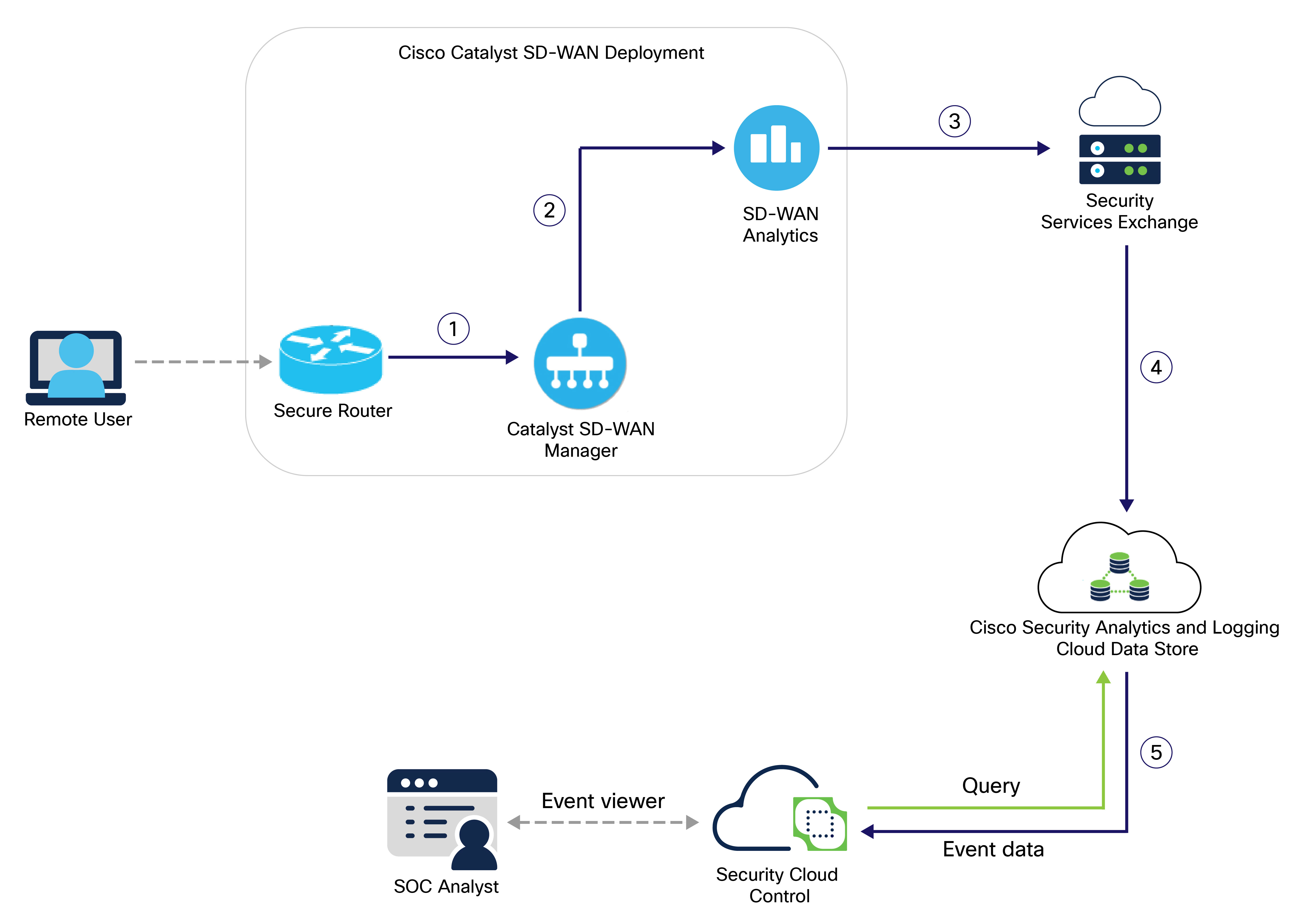 SD-WAN Analytics stores the event data in cloud to make it accessible for Security Services Exchange and notifies Security Services Exchange.