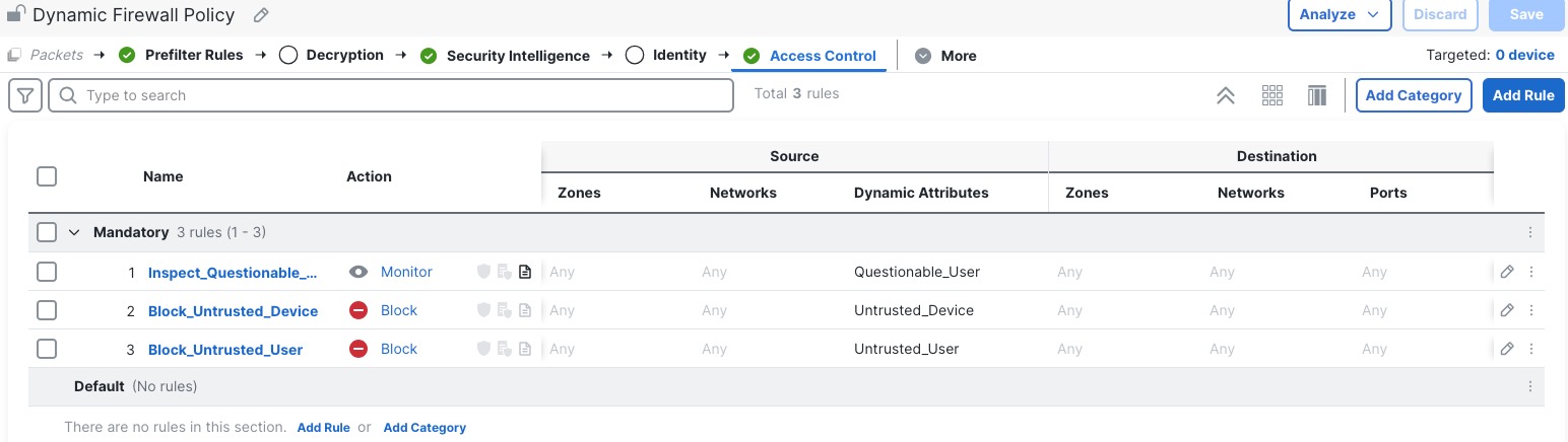 This topic discusses how you can edit the system-created access control rules and policy. Initially, the policy isn't associated with any devices but if you want to use it you can add devices, change rules, reorder rules, or delete rules.
